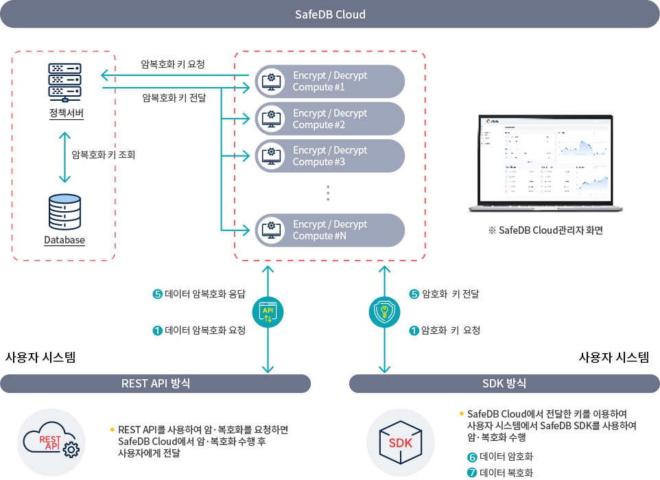 SafeDB Cloud는 데이터 암호화 솔루션을 SaaS 형태로 제공하여 초기 구축 비용없이 기업의 중요 데이터를 암호화하고 보안 컴플라이언스를 준수할 수 있는 서비스입니다.